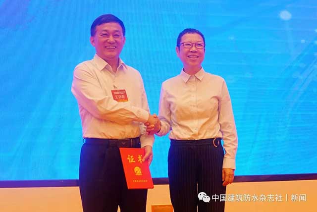 中國(guó)建筑防水協(xié)會(huì)常務(wù)駐會(huì)副會(huì)長(zhǎng)苗燕向胡希寶頒發(fā)瓦屋面分會(huì)副秘書(shū)長(zhǎng)證書(shū)。